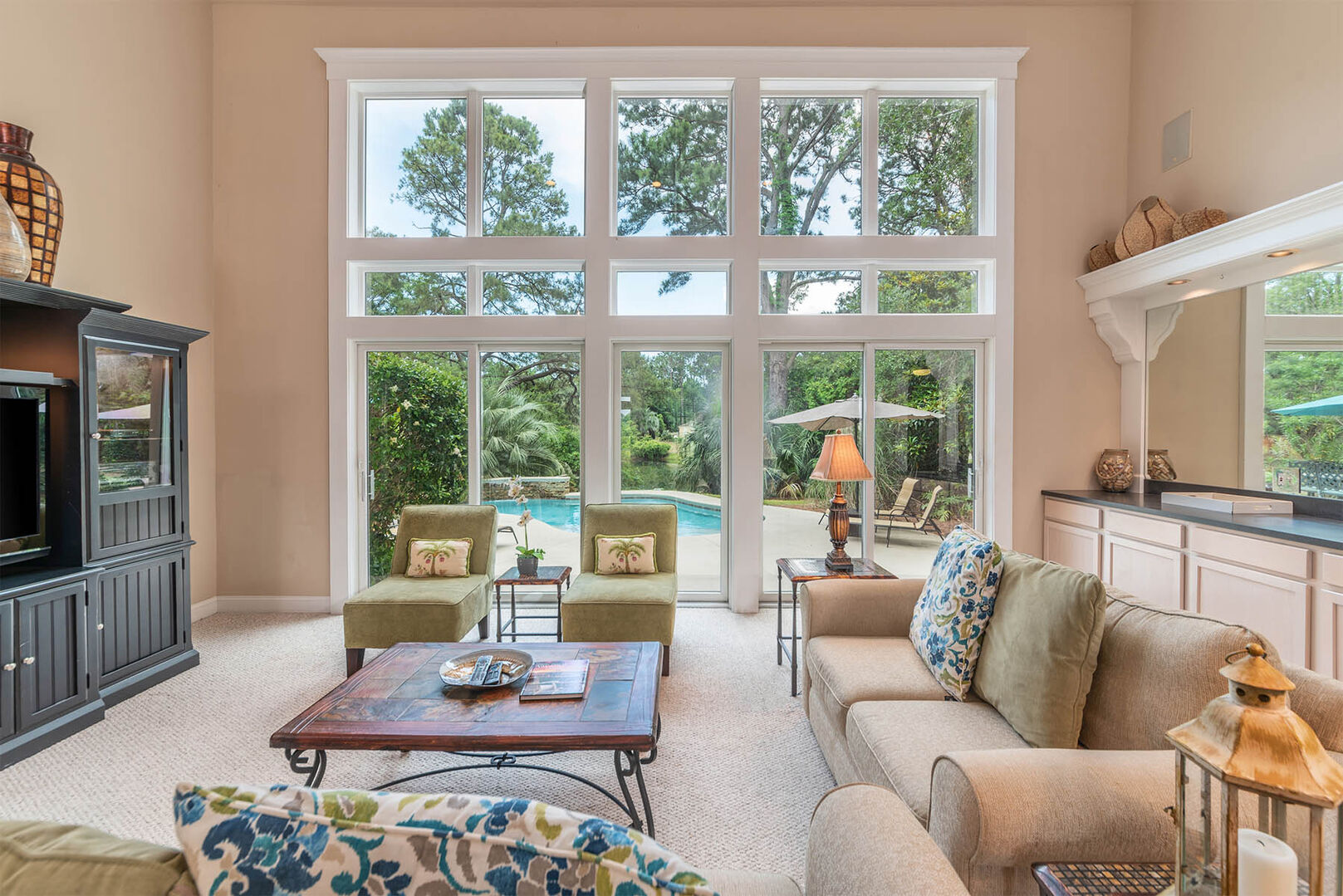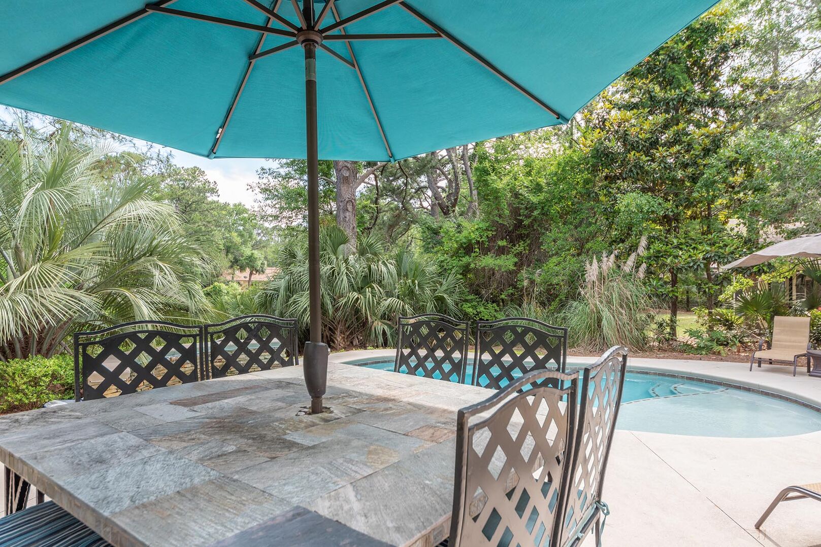 Yard Arm 3 is a spacious home located on a lovely lot in Palmetto Dunes. There is a beautiful, large, live oak tree that frames the porch and the entrance that offers a picturesque, Low Country look. From the porch you can watch the golfers on the Robert Trent Jones Golf Course. The large living room with wet bar and vaulted ceiling has a 50″ plasma TV and a view to the lagoon over the pool (can be heated for additional cost.) There is a formal dining area and a well equipped, eat in kitchen complete with granite counter tops. Off the kitchen is a powder room and laundry room.