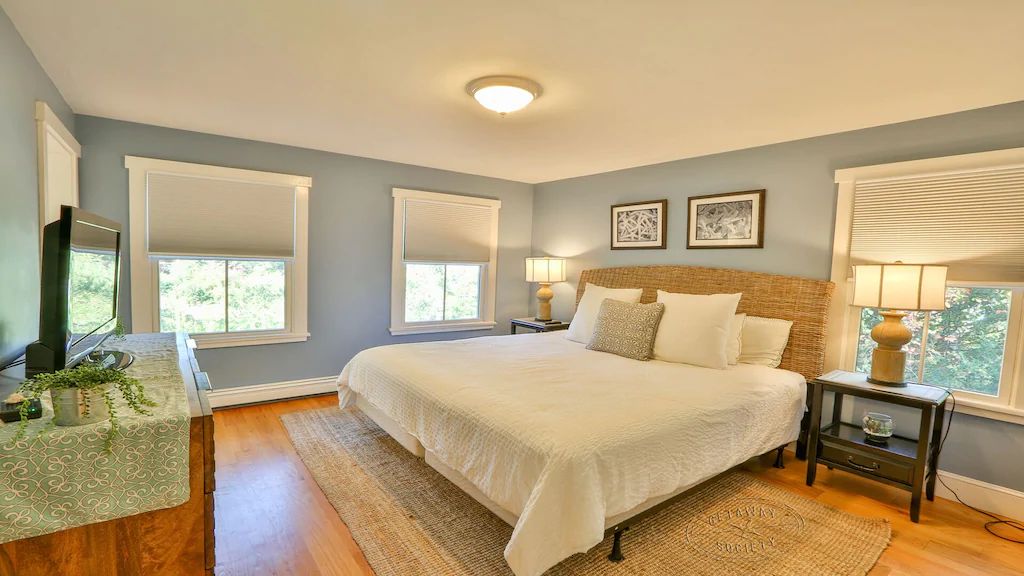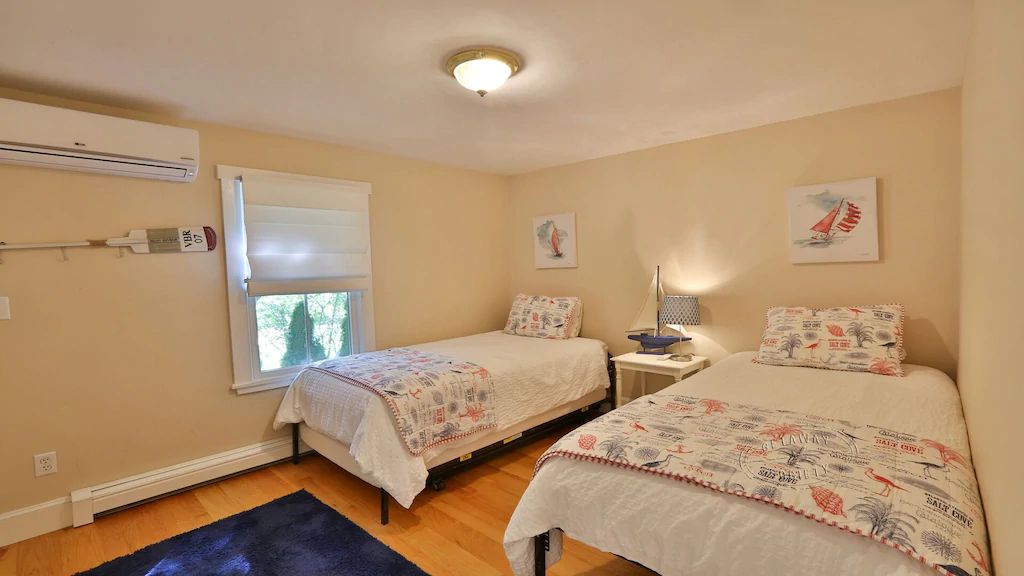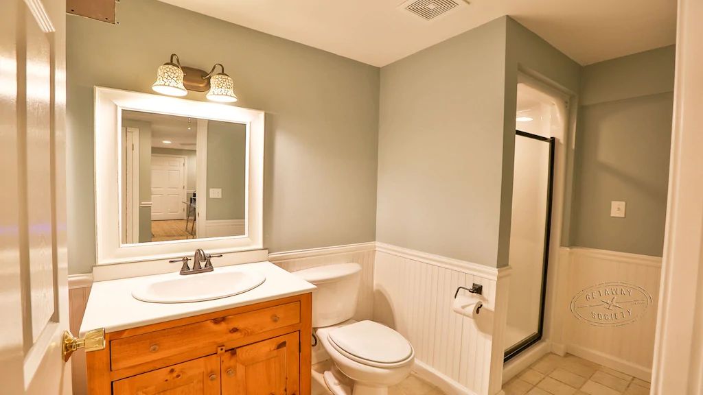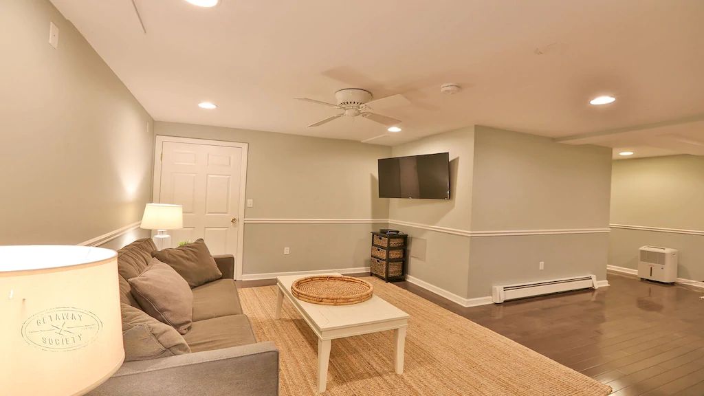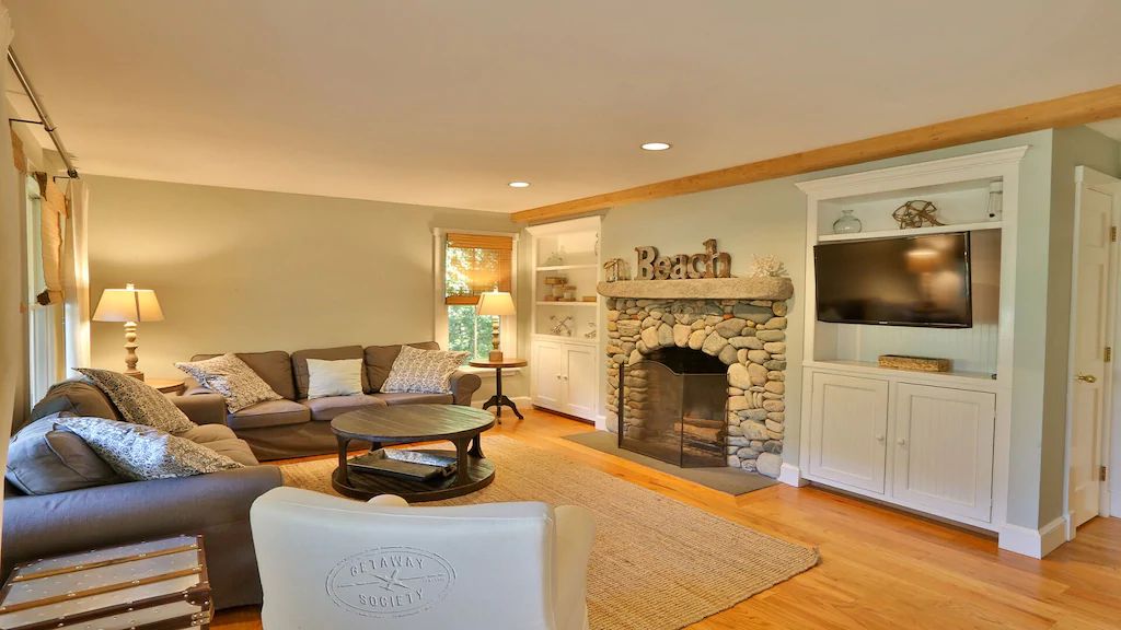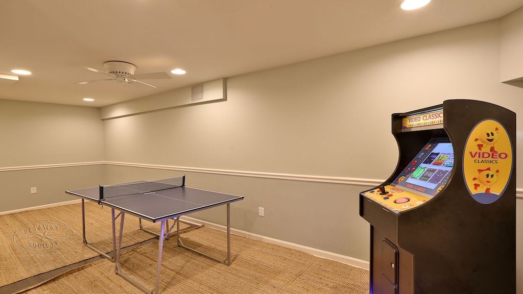 This air-conditioned home has an eat-in-kitchen and separate dining room that can accommodate up to 9 guests. The living room is accented by a 40-inch Samsung SmartTV, and a charming beach stone fireplace. Downstairs you will find a finished basement with 48-inch SmartTV, a sofa, ping pong table, and an arcade machine – perfect for kids and rainy day activities.